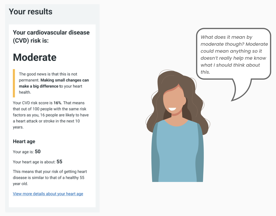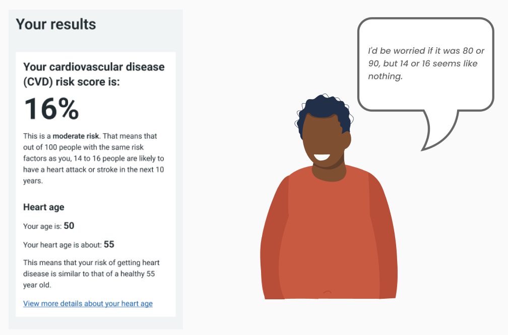 Nevertheless, participants remained uncertain about the meaning of CVD and whether they needed to take action based on these results. Instead, they continued to focus on the heart age below, which was more intuitive and understandable to them.