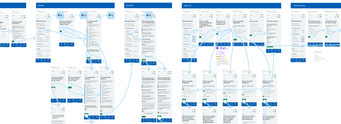 I worked closely with the Product team to build upon their efforts from the Discovery phase. This involved conducting market research to identify other services offering similar health checks and results. We meticulously mapped out relevant screens and information, with a particular focus on maintaining consistency with NHS services across the account.