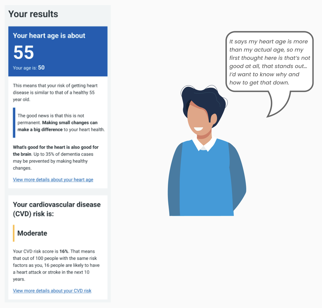 In the next round of testing, we started with the Heart age first and this led to the desired outcome. Participants could immediately determine whether there was cause for concern regarding their results at first glance. Comparing their heart age to their actual age made it evident whether improvements needed to be made or not. This approach increased confidence and provided reassurance to participants, including those with low health confidence.