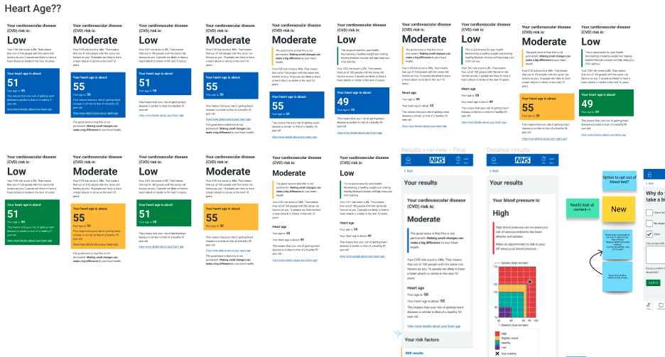 The Results page underwent multiple iterations to ensure we used the best way to present the results for the user to understand and act on if necessary. Despite my suggestion to lead with the Heart Age for easier comprehension, a decision from Policy emphasised focusing on the Cardiovascular Disease (CVD) risk score, aligning with the service's primary purpose.