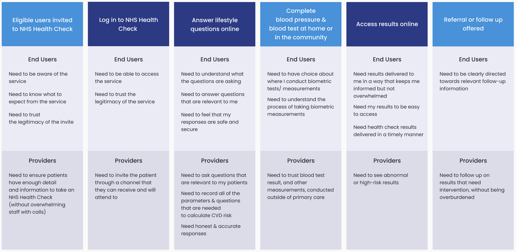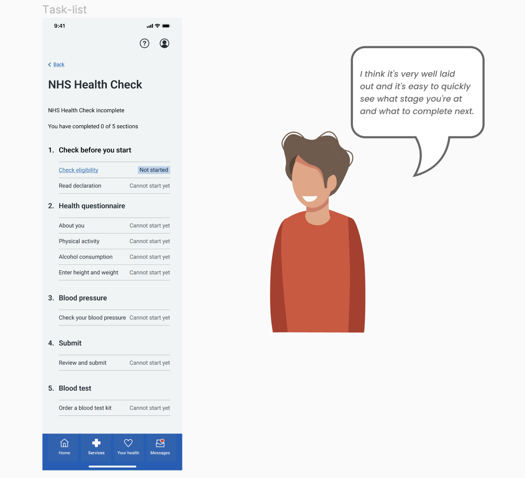 Therefore, we implemented a Task list to illustrate the step-by-step progression of the health check, outlining the various stages of the service and indicating whether they have been completed. Feedback from subsequent rounds of testing revealed that users, upon reviewing the Task list, acquired a clearer understanding of the journey and felt more confident of what it includes and how long it might take them to complete it.
