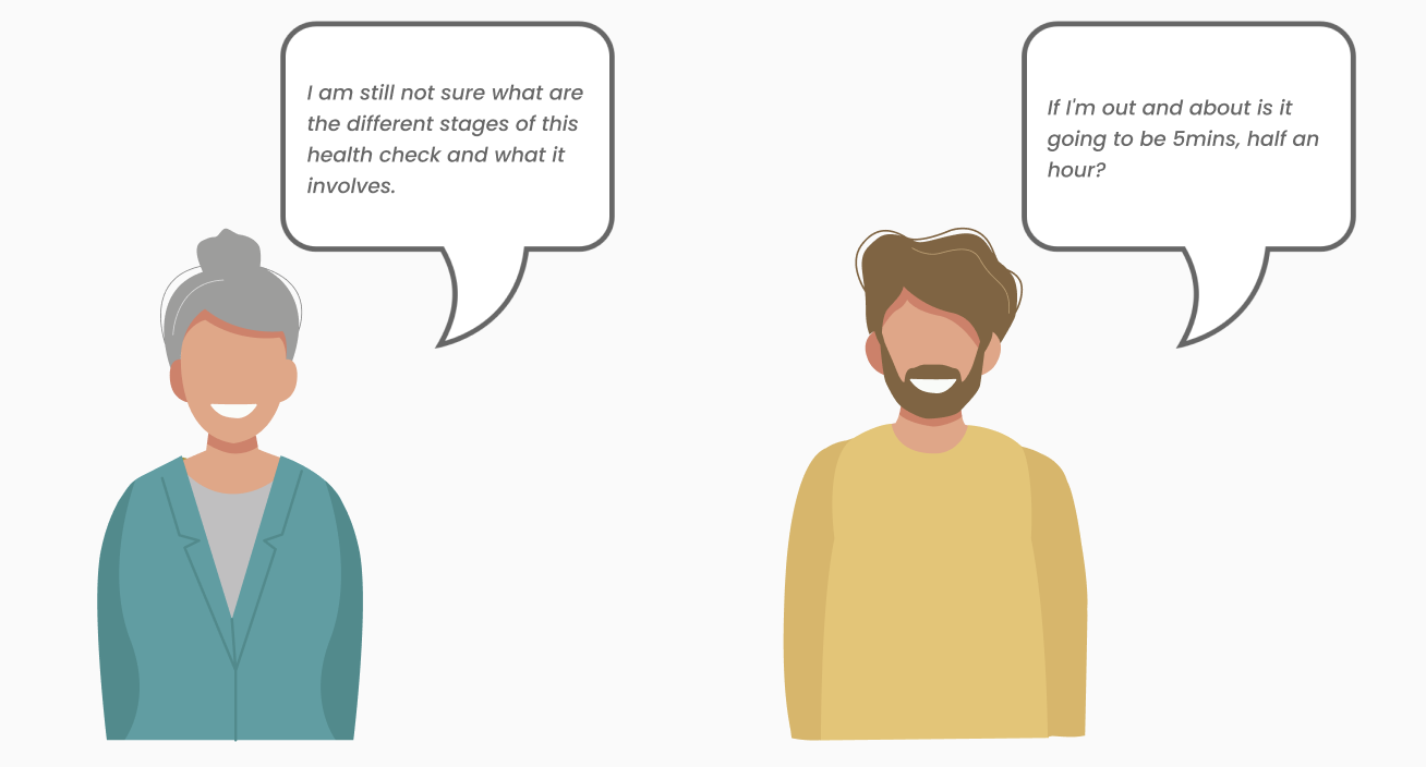 It's challenging to predict the duration of the journey, as it involves measuring weight, blood pressure, and conducting a blood test, which can vary significantly depending on the user. However, we can introduce structure to the journey to clarify what's involved in a more tangible way, making it easier for users to understand than relying solely on text.