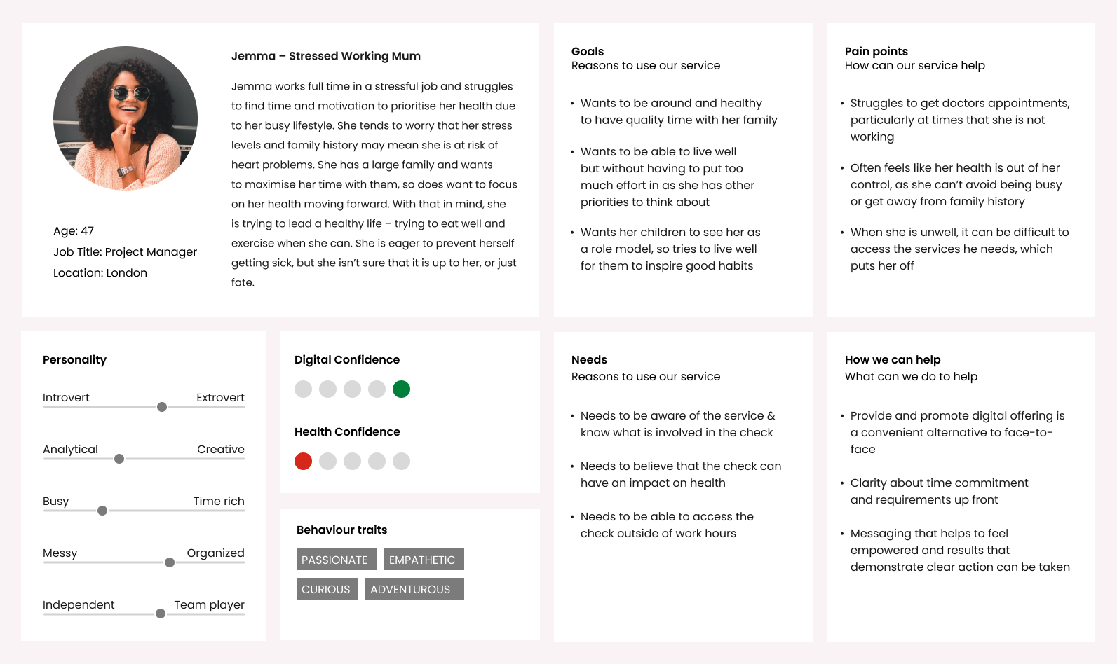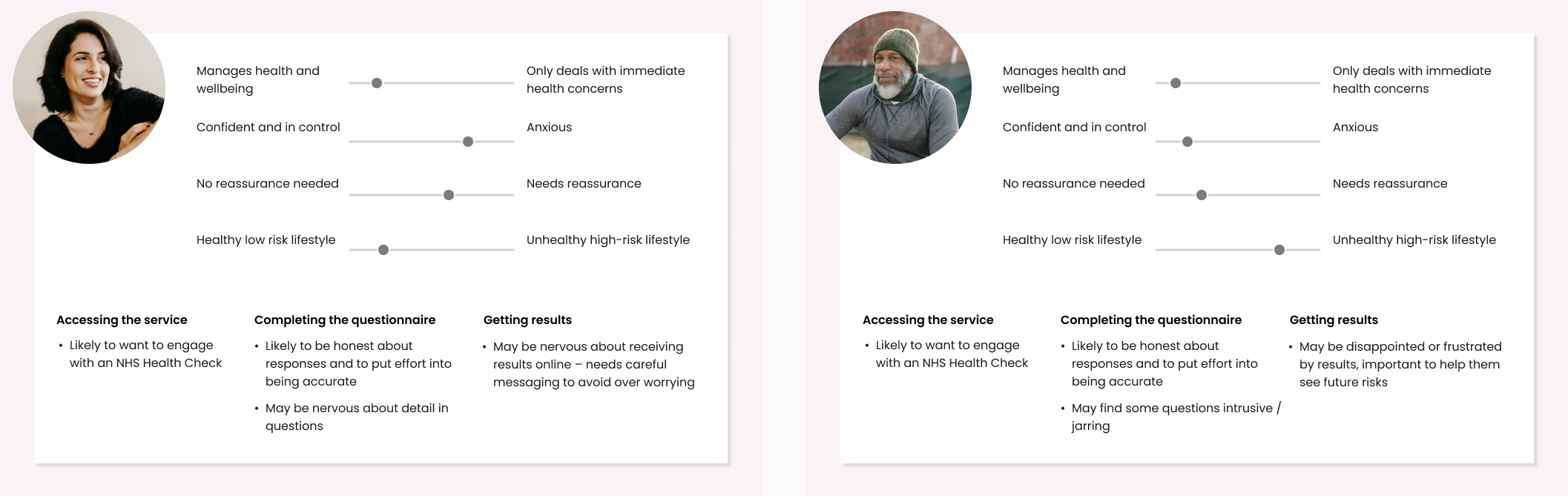 We developed profiles of potential users across these scales, and made some assumptions about what this may mean in the context of a digital offering. These are just examples and potential ways that people will react and experience the Health Check – based on what we have seen in research.