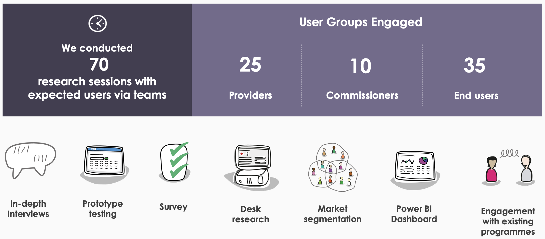 - desk research (reviewing prior research and pilots & engagement with existing teams) - to ensure that we weren’t duplicating work and had clearly identified gaps prior to conducting our own research